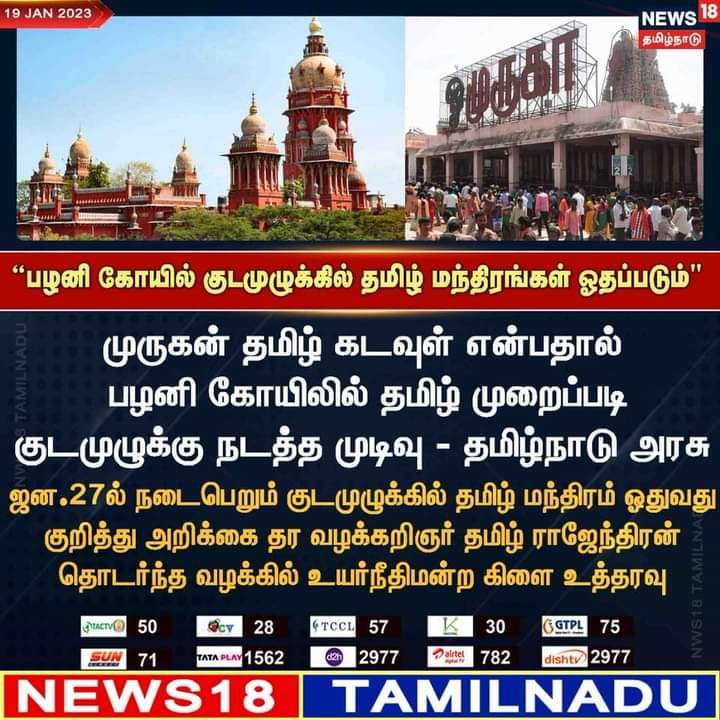 பழனி கோயில் குடமுழக்கில் தமிழ் மந்திரங்கள் ஓதப்படும் .முருகன் தமிழ் கடவுள் என்பதால் பழனி கோயிலில் தம...